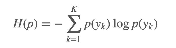 Entropy 란, 주어진 분포 $p(y)$ 에 대한 불확실성(uncertainty)를 나타냅니다. Entropy가 높다라는 것은 주어진 값에 대해 불확실성이 높다라는 의미입니다. 예를 들어, 동전던지기를 통해 앞,뒷면이 나올 확률을 나타내는 분포(예, 베르누이 분포)가 있다고 했을때, 던질때마다 앞면이 나오는 동전의 Entropy는 $H(p) = - 1*log_2(1) = 0$ 이 됩니다. 즉, 앞면이 나오는 상황이 놀랍지 않다는 것이지요. Entropy는 아래의 식으로 정의됩니다.
