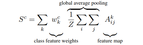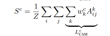 이전에 소개한 CAM에 대해 다시 상기해보면, CAM은 특정한 구조를 가진 CNN이 image classification을 하기 위해서 "localization map"을 생성한다. 이는 softmax layer에 적용되기 전에 global average pooling을 통해 이루어지며, ${A}^{k} \in {R}^{u \times v}$ (A: feature map,k: feature, u: width, v:height) 라는 feature map을 생성한다. 즉 ${A}^{k}$ feature map은 Global Average Pooling(GAP)을 통해 pooling 되고, 각각의 class $c$에 대해 score(${S}^{c}$)를 생성하기 위해 선형 변환을 수행해준다.